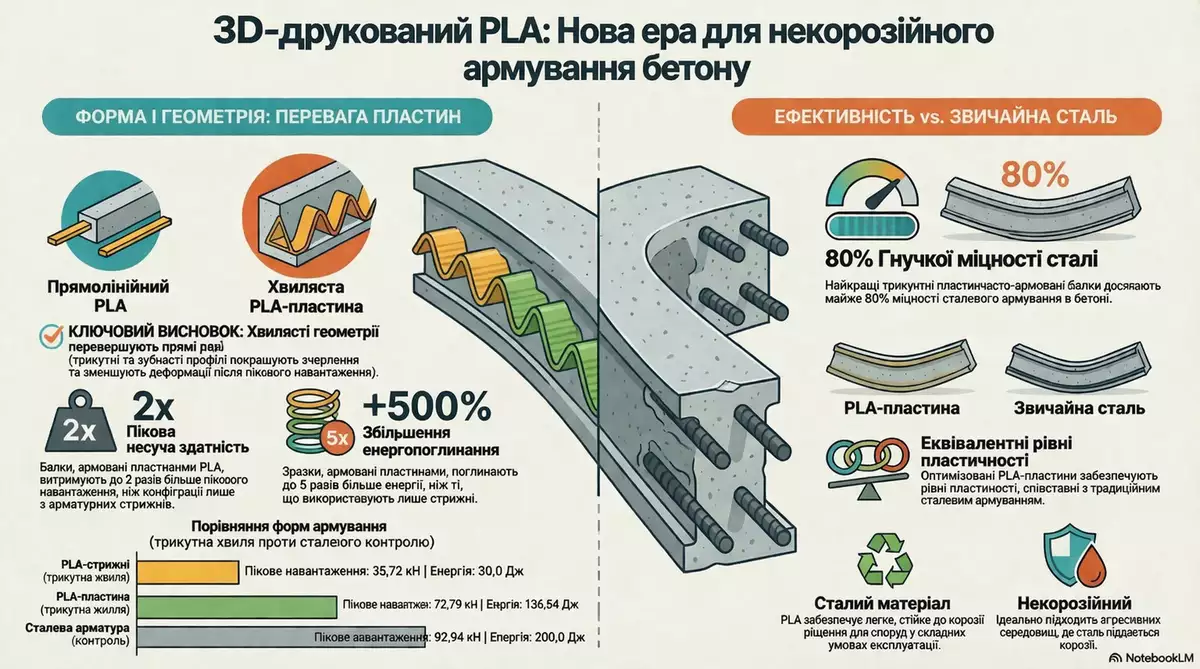Ключовий кількісний результат: пластини, армовані PLA, досягли до вдвічі більшого пікового навантаження і поглинули до п’яти разів більше енергії (в’язкість до руйнування), ніж ті, що використовували прості PLA-стержні. Збільшена площа поверхні пластин забезпечила значно міцніший зв’язок із бетоном.