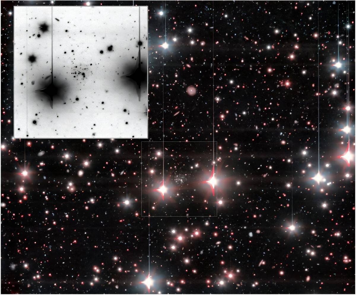 Зібране зображення Andromeda XXXVI, отримане за допомогою OSIRIS+, з полем зору 7,8 × 7,8 кутових хвилин. На вставці показано збільшене зображення Andromeda XXXVI у негативному кольорі. Надлишкову щільність чітко видно між двома яскравими зірками на передньому плані. Північ — вгорі, схід — ліворуч. Джерело: arXiv (2026). DOI: 10.48550/arxiv.2603.28492