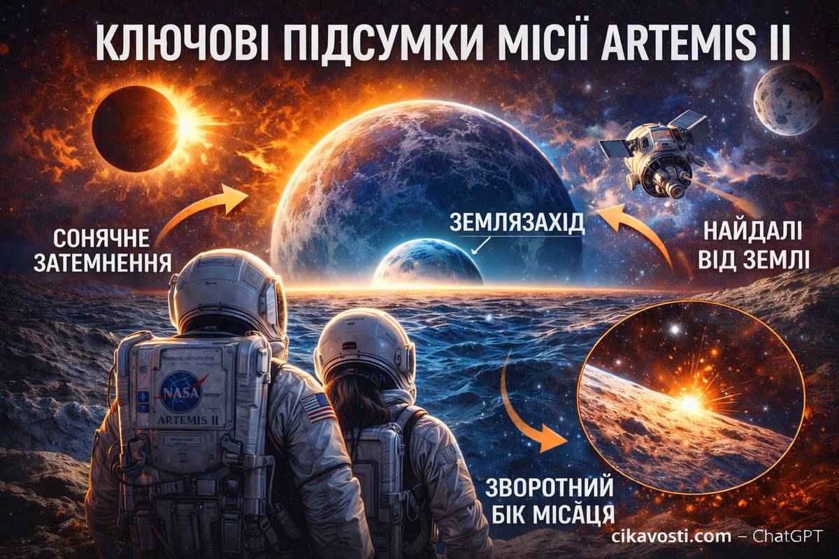 10 квітня 2026 року капсула Orion з позивним «Integrity» приводнилась у Тихому океані біля Сан-Дієго — і місія Artemis II офіційно завершилась. Перший за 54 роки пілотований обліт Місяця пройшов успішно: чотири астронавти встановили рекорд дальності, побачили зворотній бік Місяця власними очима і повернулись додому живими. Але місія — це перш за все тест: вона дала NASA безцінні дані для підготовки посадки на Місяць. Як повідомляє phys.org із посиланням на дані NASA та AFP, ось що виявилось справді важливим.