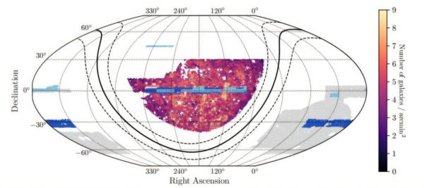 Карта щільності галактик у нашому каталозі форм. Ми також показуємо зону охоплення трьох інших досліджень лінзування Stage-III: DES Y3 (сірий), KiDS-1000 (темно-синій), HSC Y3 (світло-синій). Пунктирні лінії позначають галактичну площину з альфа = ±10o. Наш каталог складається з 107 мільйонів галактик, що охоплюють площу 5412 кутових секунд. Відстань між нашою площею та галактичною площиною є результатом нашої маски щільності зірок. Ця маска також є асиметричною через наявність галактичного виступу. Джерело: The Open Journal of Astrophysics (2025). DOI: 10.33232/001c.146158