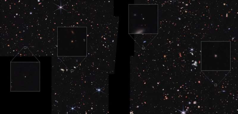 На цьому зображенні показані чотири з дев’яти дивних галактик, які астрономи називають «астрономічним качкодзьобом». JWST виявив їх під час свого дослідження «Cosmic Evolution Early Release Science Survey» (CEERS). Вони відрізняються від інших галактик своїм точкоподібним виглядом, хоча їм бракує звичайних рис, які роблять галактики точкоподібними. Джерело: NASA, ESA, CSA, Стів Фінкельштейн (UT Austin); Обробка зображення: Алісса Паган (STScI)