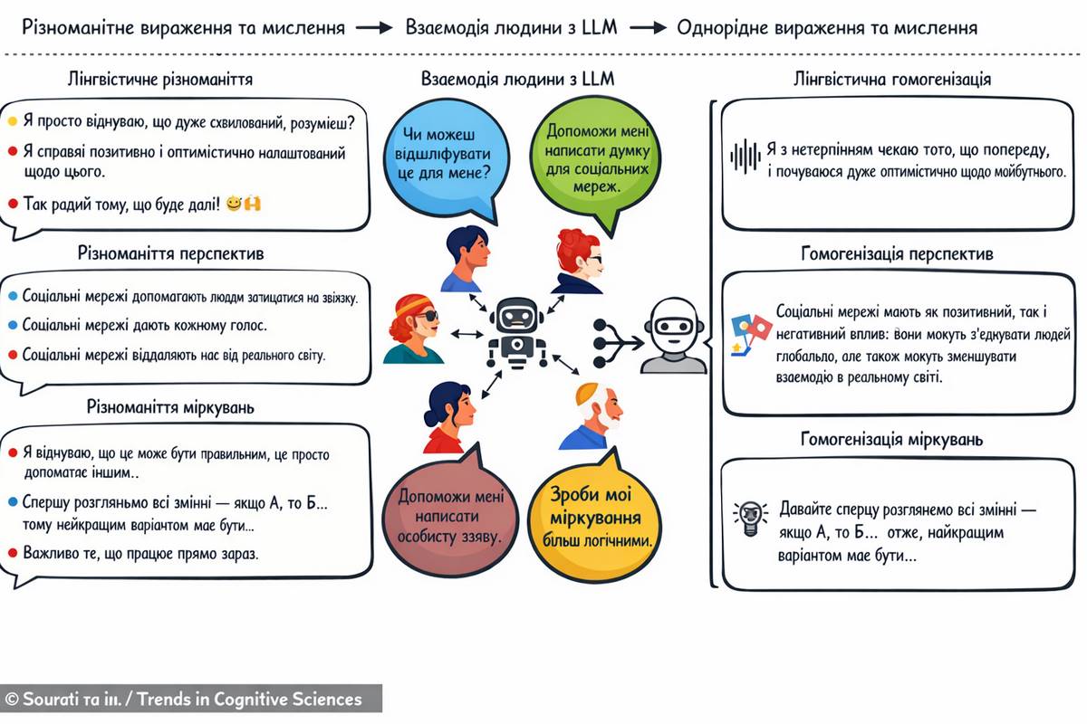 Мільярди людей щодня звертаються до одних і тих самих чат-ботів — ChatGPT, Gemini, Claude, Copilot — щоб відредагувати листа, відшліфувати текст або краще сформулювати думку. Це зручно. Але нове дослідження, опубліковане у журналі Trends in Cognitive Sciences (Cell Press), попереджає: масове використання великих мовних моделей поступово знищує когнітивну різноманітність людства — те, що робить нас унікальними мислителями, а суспільства — здатними до творчості й адаптації.