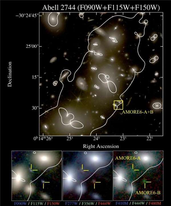 На цьому рисунку показано мозаїчне зображення поля Abell 2744. Спостережуване положення системи AMORE6-A+B показано жовтим квадратом. Джерело: Morishita et al. 2025. Природа