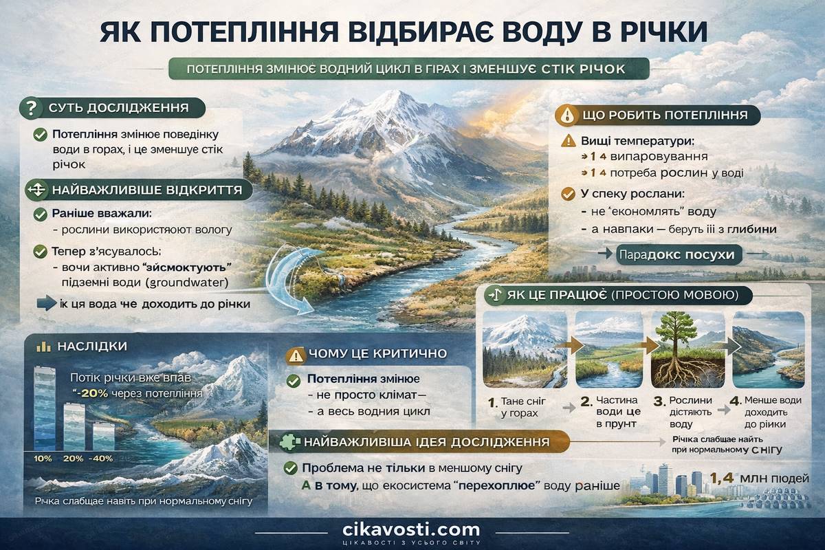 ❓ Чи стосується ця проблема лише Колорадо? Ні. Той самий механізм — залежність від «старої» підземної води у міру зменшення снігового покриву — характерний для більшості засніжених гірських водозборів планети. Аналогічна ситуація розгортається в Альпах (де від снігу залежить водопостачання Центральної Європи), Гімалаях (де від льодовиків і снігу живляться найбільші ріки Азії) і Андах. Загалом від гірського кріосферного живлення залежить водопостачання понад 2 мільярдів людей.