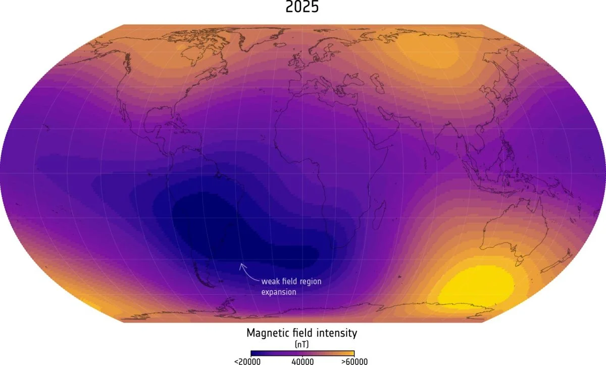 Особливу увагу привернула Південноатлантична аномалія — зона ослабленого магнітного поля. З 2014 року вона розширилася майже на половину площі континентальної Європи. У цьому регіоні супутники зазнають підвищеного радіаційного навантаження. Це створює ризики для космічних технологій.