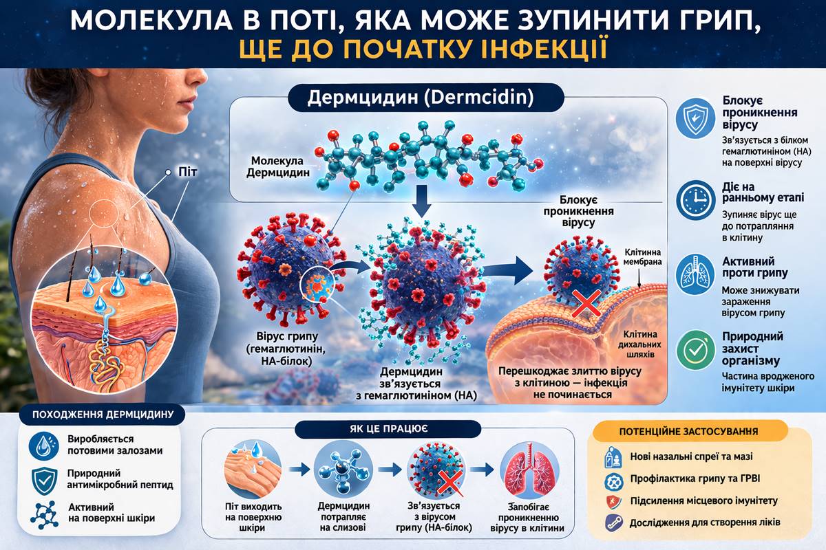 Чи замінить дермцидин щорічні щеплення від грипу? Ні, принаймні не найближчим часом. Дослідження поки у фазі лабораторних і тваринних моделей. Але воно відкриває напрямок для принципово нового типу профілактики — не на основі антитіл до конкретного штаму, а на основі блокування незмінної частини вірусу. Паралельно про внутрішні захисні механізми організму вчені дізнаються дедалі більше.