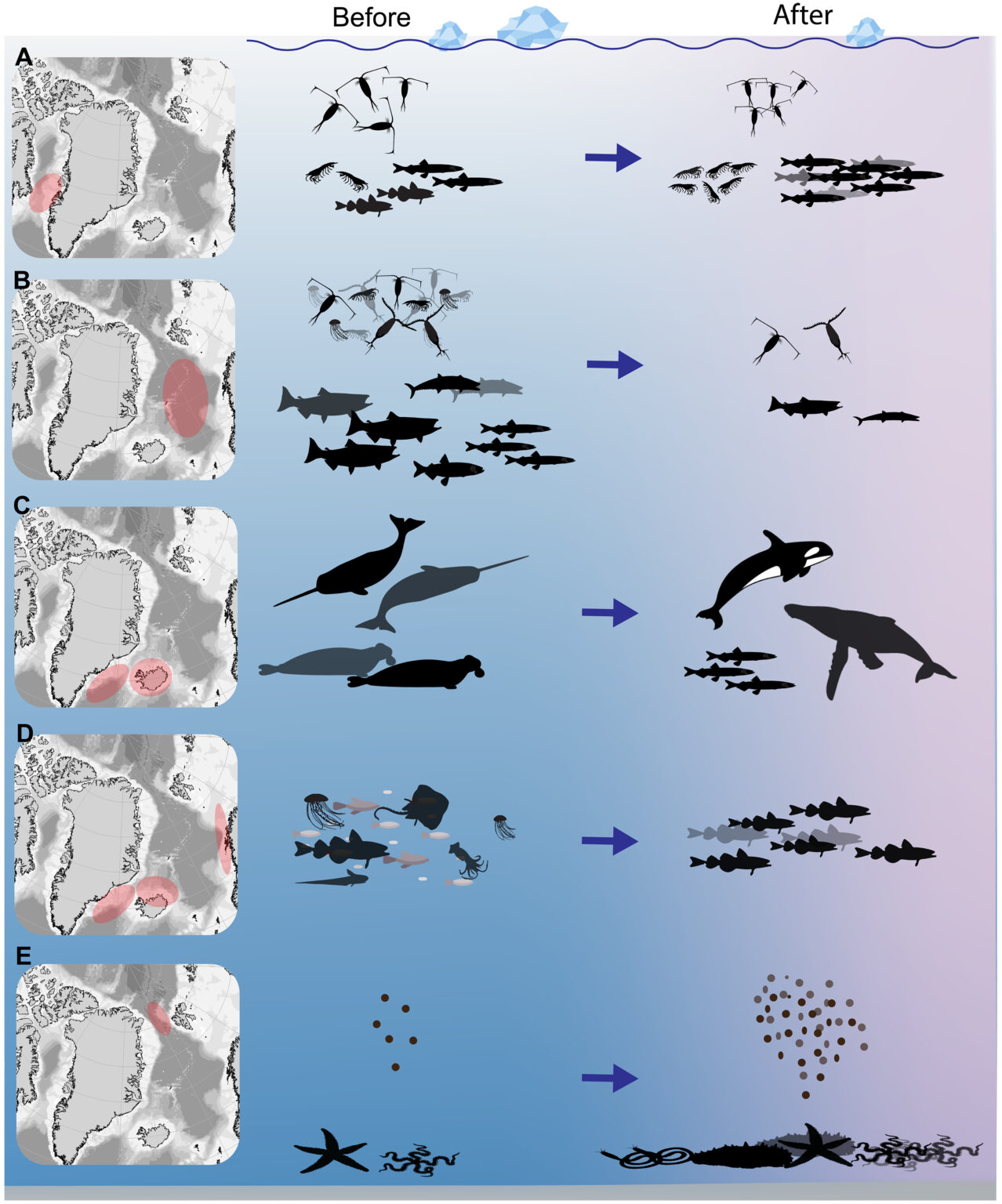 «У кожному регіоні відбулася зміна від холодоадаптованих видів до теплолюбних», — підкреслюють автори. Після 2003 року почастішали спостереження косаток і вусатих китів. Водночас чисельність нарвалів і тюленів-капюшонів помітно скоротилася.