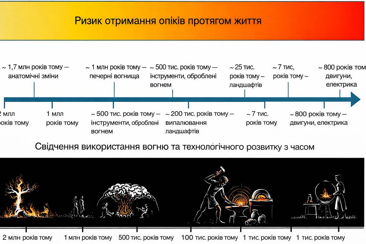 Вогонь — одна з ключових рушійних сил людської еволюції: він дозволив готувати їжу, освоювати холодні клімати, розробляти металургію та кераміку. Але є один аспект цих стосунків з вогнем, який до цього часу залишався поза увагою дослідників. Нове дослідження Imperial College London, опубліковане у журналі BioEssays (DOI: 10.1002/bies.70109, лютий 2026 р.), пропонує «гіпотезу відбору через опіки» (Burn Selection Hypothesis): повторне виживання після теплових опіків протягом щонайменше мільйона років стало унікальним еволюційним тиском, що прискорило зміни у генах загоєння ран, запалення та імунного захисту — і відокремило людину від усіх інших приматів.