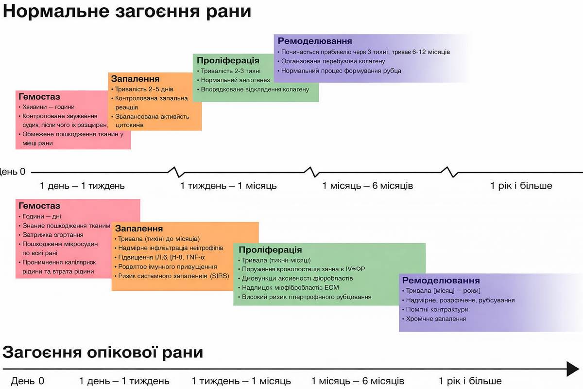 Саме тому при тяжких опіках людський організм реагує неадекватно: надмірне системне запалення, гіперімунна відповідь, масивне рубцювання і навіть поліорганна недостатність. Ті самі механізми, що колись рятували життя при звичному побутовому опіку, сьогодні можуть вбивати у відділеннях опікової хірургії.