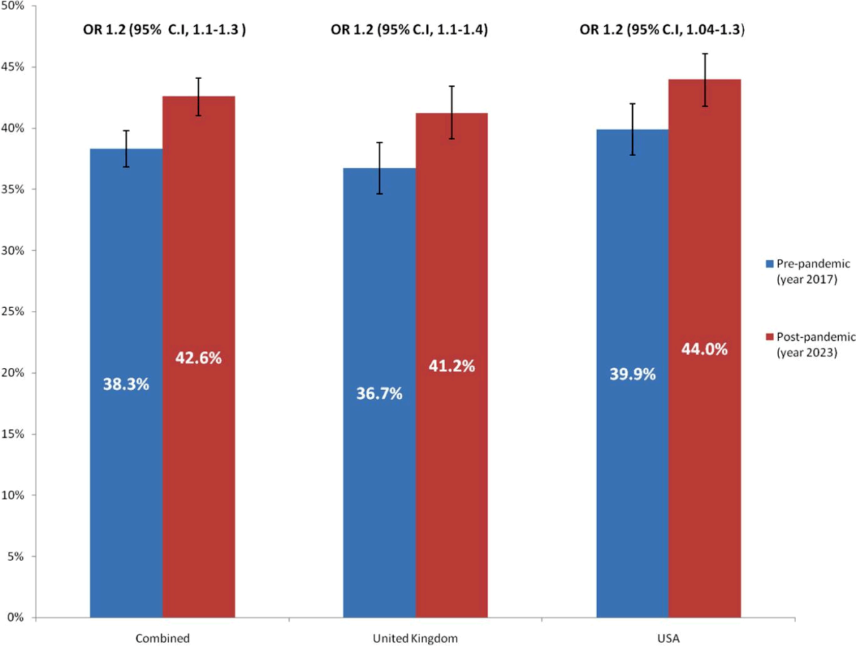 Велике міжнародне дослідження, опубліковане в Clinical Gastroenterology and Hepatology, виявило, що поширеність цих розладів зросла з 38,3% до 42,6% у порівнянні з даними до пандемії. «Це перше дослідження, яке на рівні всієї популяції фіксує зміни після COVID-19 за допомогою послідовної методології», — зазначають автори.