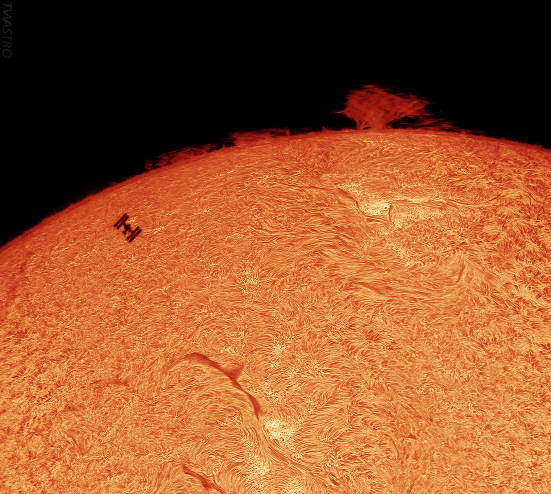Ендрю Маккарті і Том Вільямс сфотографували недавній транзит МКС (Міжнародної космічної станції) по диску Сонця. На фото Маккарті станція знаходиться поруч з групою сонячних плям, на знімку Вільямса — з протуберанцем.