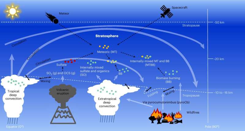Схематичне зображення динаміки стратосфери та частинок. Джерело: Nature Geoscience (2025). DOI: 10.1038/s41561-025-01821-1
