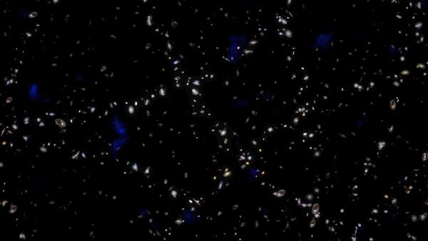 Ілюстрація показує, що вздовж пульсацій первинних звукових хвиль (позначених синім кольором) утворилося трохи більше галактик, ніж в інших місцях. Потім кільця галактик розтягувалися з розширенням Всесвіту. Інші галактики на цьому зображенні затемнені, щоб зробити ефект більш помітним. Фото: NASA