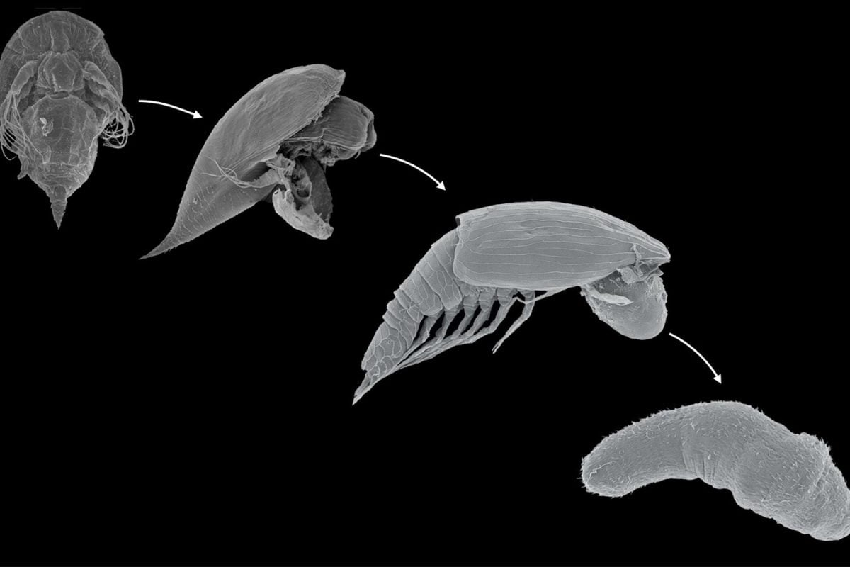 На цьому зображенні показано життєвий цикл y-личинки від y-наупліуса до y-циприди, а потім до yпсигона (останньої відомої стадії), яка є червоподібною стадією, що виникає з попередньої личинкової стадії, якщо y-циприда піддається впливу гормонів линьки ракоподібних. Дослідники вважають, що його червоподібна стадія, ймовірно, є паразитичною і може приживатися в організмі хазяїна. Кожна з них має довжину близько 100 мікрометрів (1/10 міліметра). Фото: Ніклас Драйер