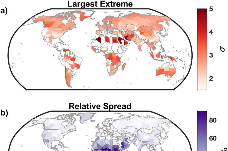 Аналіз показав, що відносно місцевого клімату найекстремальніша вологість спостерігається на Близькому Сході та в Північній Африці, а тропічні регіони посідають друге місце. У цих районах температура вологого термометра може перевищувати середні сезонні значення на 4–5 стандартних відхилень. Близький Схід і Північна Африка також вирізняються тривалими періодами вологої спеки, які подекуди тривають понад 20 днів поспіль.