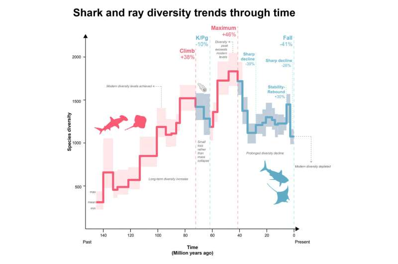 Пікове різноманіття акул і скатів припало на середину еоцену — близько 50 мільйонів років тому, коли океани підтримували значно більше видів, ніж сьогодні. Відтоді ці групи втратили понад 40 % свого видового багатства, зробивши сучасні океани значно менш різноманітними з еволюційного погляду.