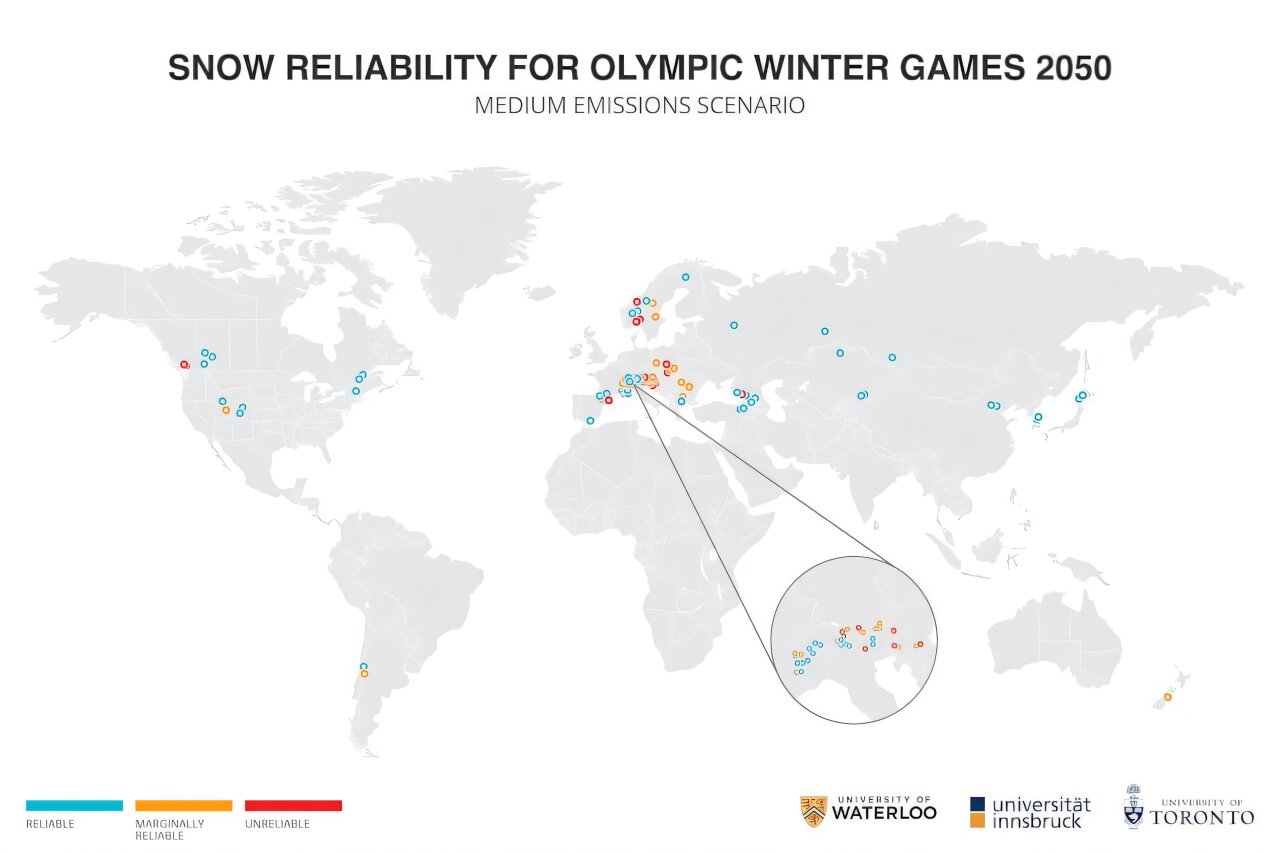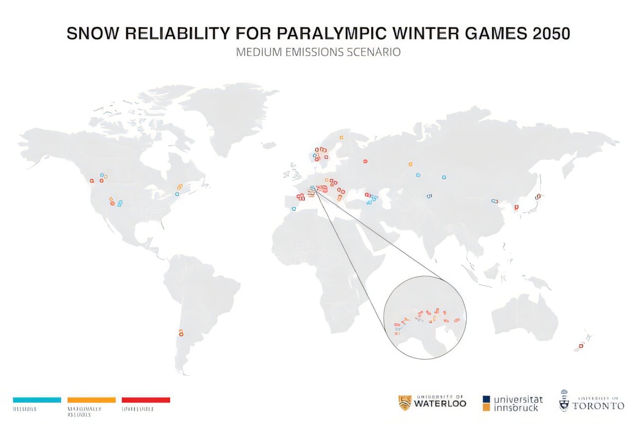 Для Олімпійських і Паралімпійських ігор кліматичний фактор стає вирішальним у виборі міст-господарів. Дослідження 2024 року, що охопило 93 потенційні локації, засвідчило: навіть із сучасним штучним снігоутворенням до 2050-х років кількість надійних місць зменшиться вдвічі. Для Паралімпійських ігор придатними залишаться лише 17–31 локація, що ставить під сумнів їхню довгострокову стабільність.